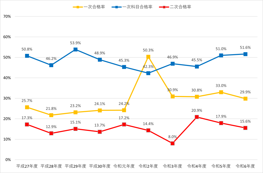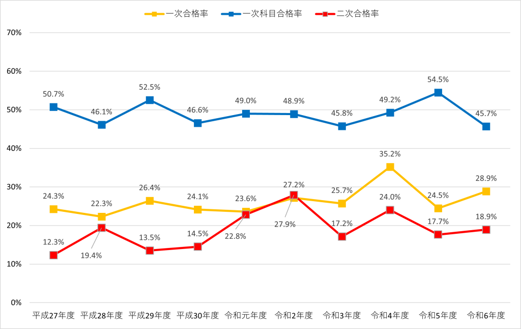 過去10年間の一種の一次試験の合格率は例年15%前後、二次試験は20~30%程度となっております。