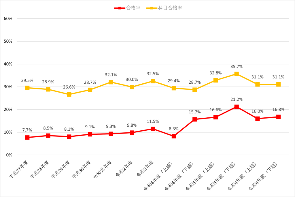 一次試験の科目合格率は50%前後です。これはある程度対策ができている受験者が多いからと言えるでしょう。