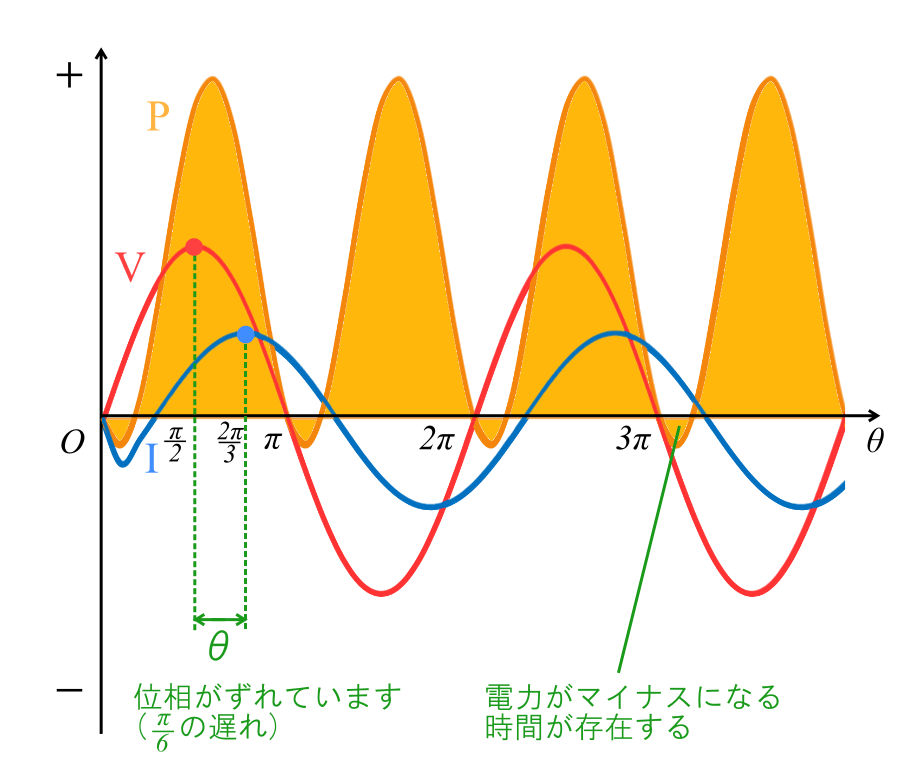 また、この力率角θは電圧と電流の位相差でもあります。