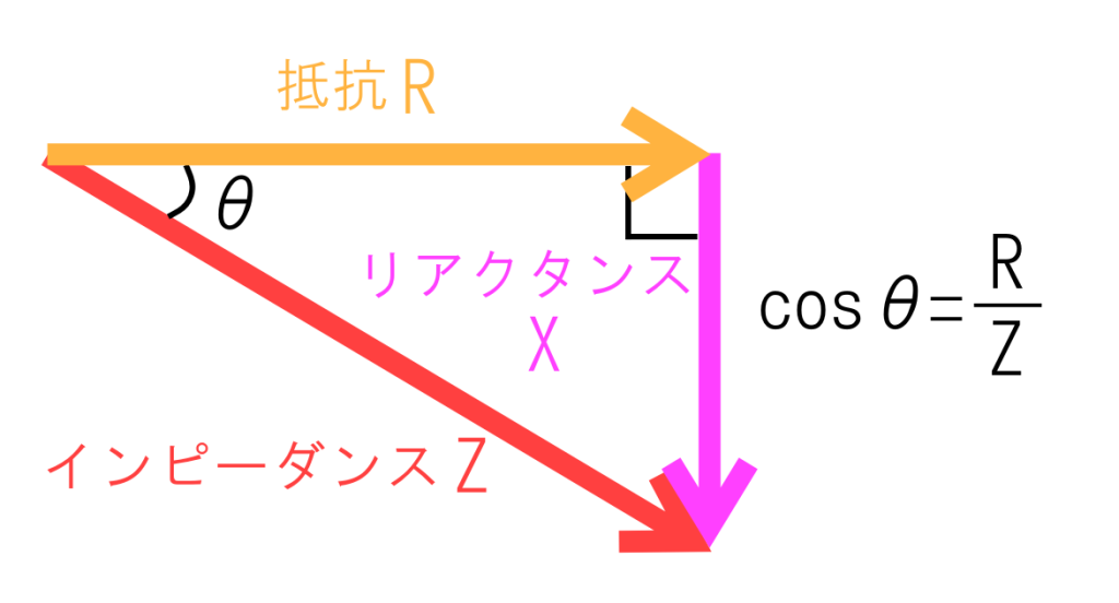 力率のcosθのθは、以下のようなベクトル図において、皮相電力と有効電力が作る角であり、インピーダンスと抵抗の作る角でもあります。(力率角)