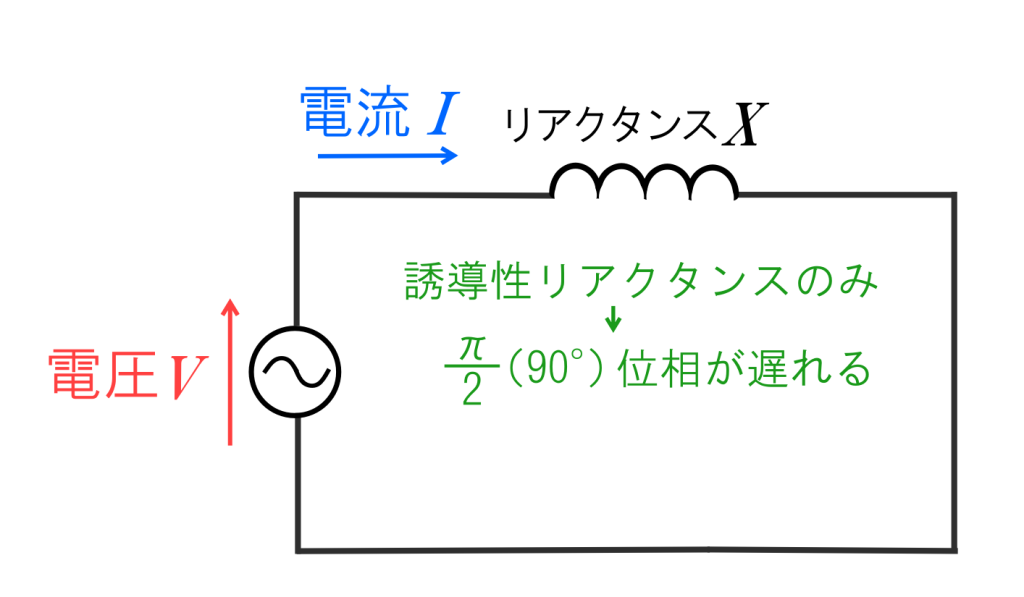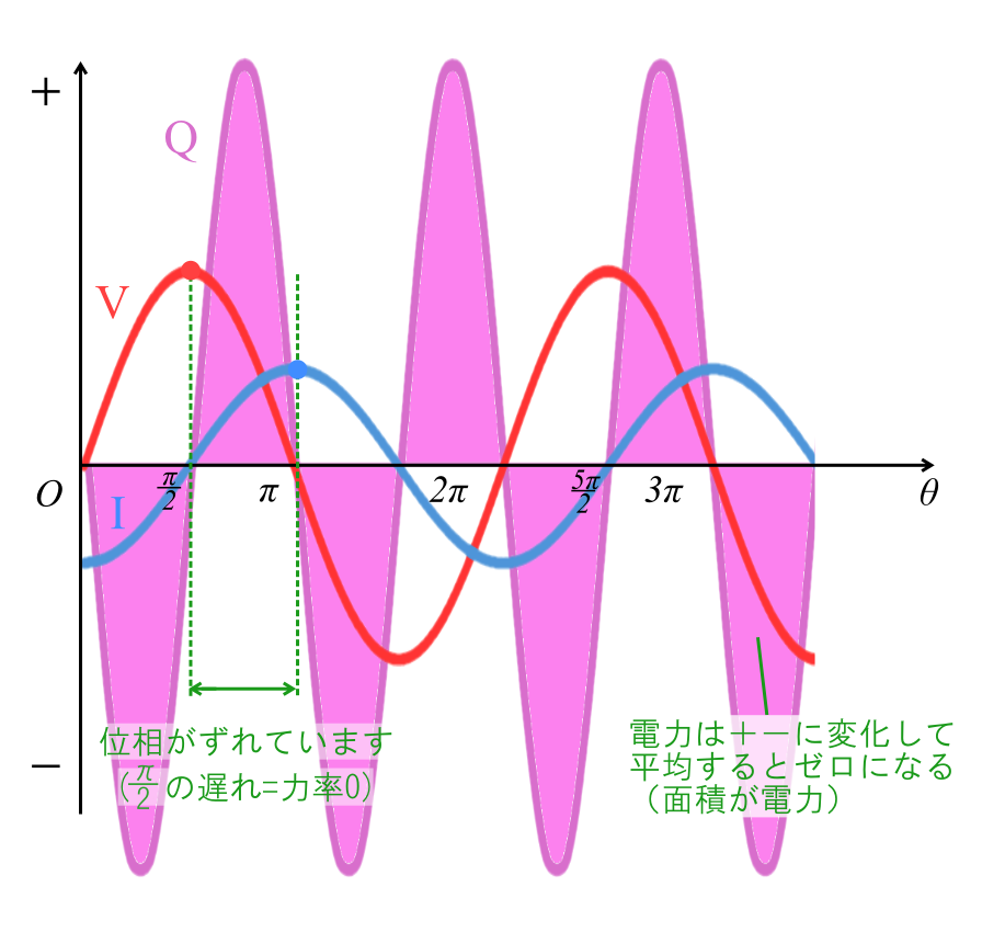コイルやコンデンサは電圧と電流の位相が\(90\text{°}\)\(\displaystyle\left(\frac{π}{2}\right)\)ずれていて、電力はプラスとマイナスを繰り返し、平均するとゼロとなります。