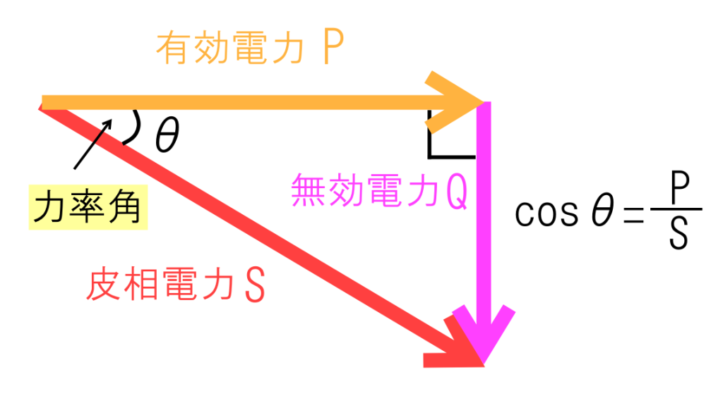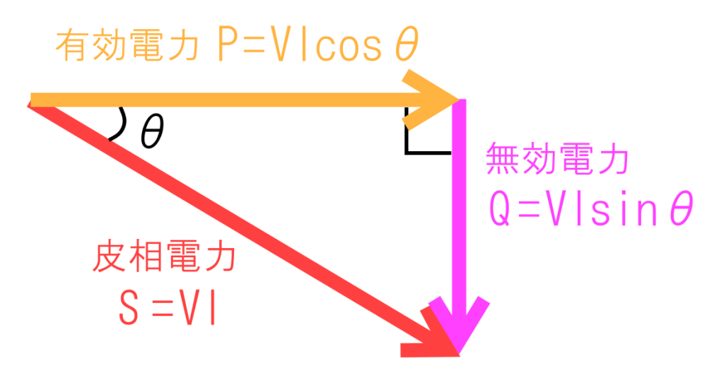 有効電力、皮相電力、無効電力の関係をベクトル図で表すと以下のようになります。
