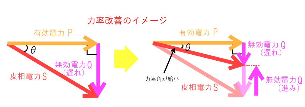 力率の改善のためには、無効電力を小さくする必要があります。