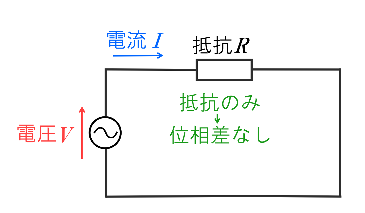 抵抗のみであれば、電圧\(V\)と電流\(I\)の時間変化(位相)が同じなので、単純に電圧\(V\)×電流\(I\)で求めることができます。