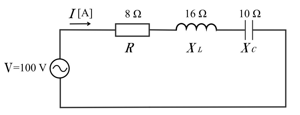 【例題】図のような交流回路において、電源電圧V=100V、抵抗R=8Ω、誘導性リアクタンスXL=16Ω、容量性リアクタンスXC=10Ωである。この回路の消費電力(有効電力)は。