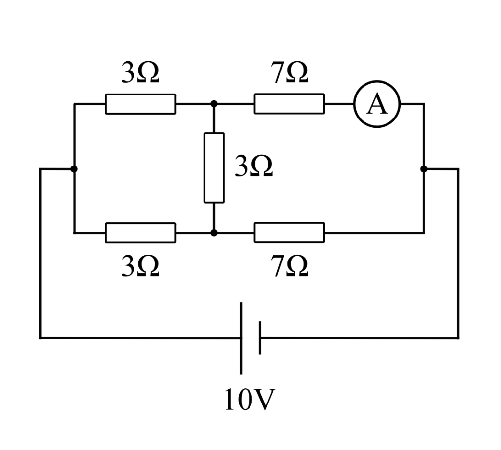 \(I=\displaystyle\frac{V}{R}=\displaystyle\frac{10}{10}=1\)
