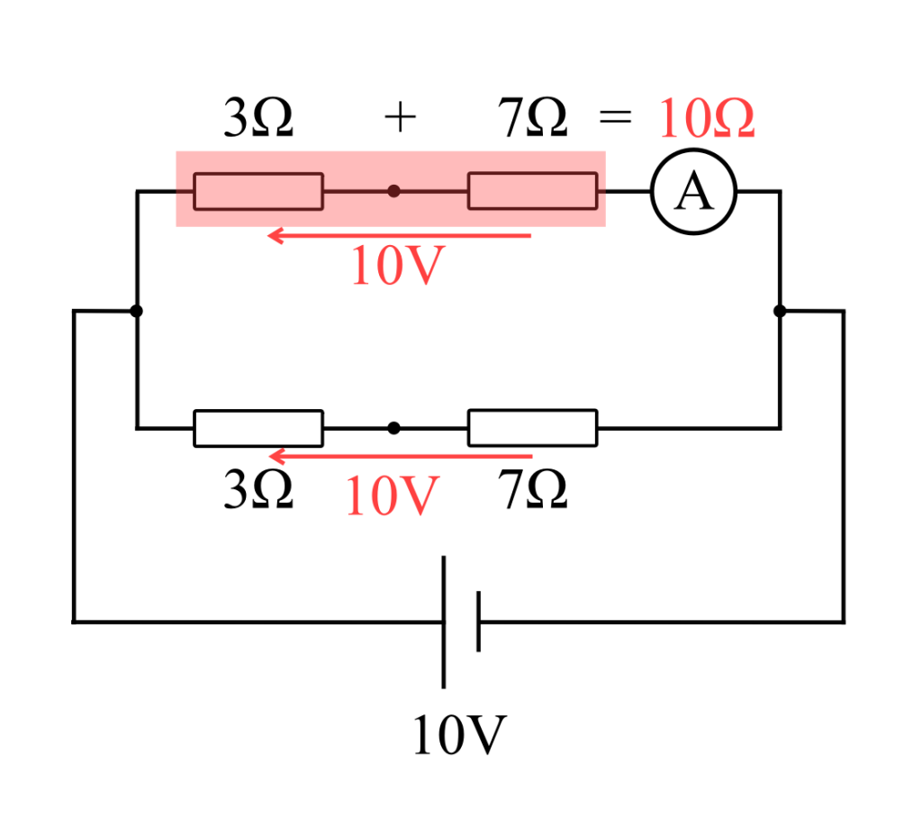 電源電圧が10V、並列回路なので電流計のある側の抵抗に対しても10Vの電圧がかかる為、オームの法則より、