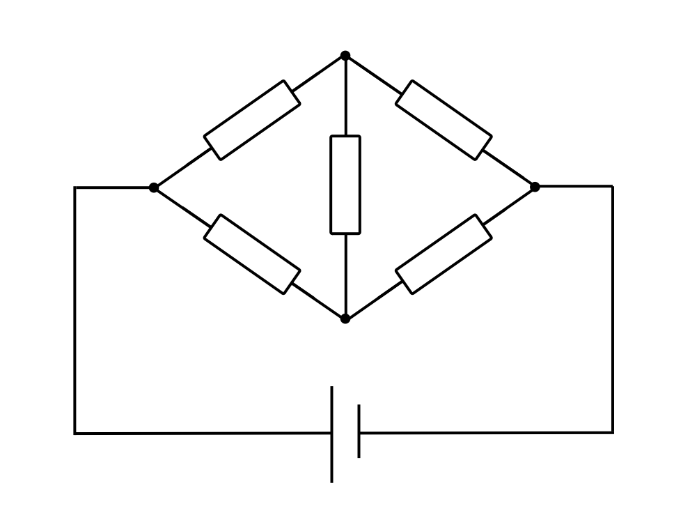 抵抗の並列接続の部分に注目するとブリッジ回路になっていることがわかります。