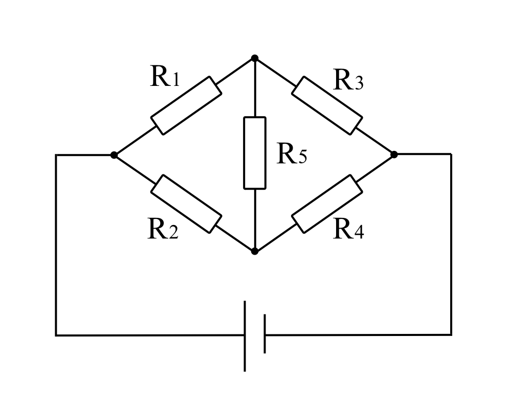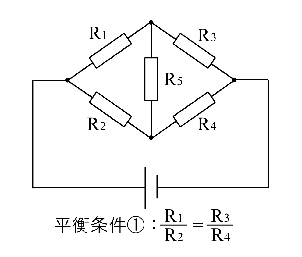 ブリッジ回路では、4つの抵抗\(R_1\)、\(R_2\)、\(R_3\)、\(R_4\)において、\(\displaystyle\frac{R_1}{R_2}=\displaystyle\frac{R_3}{R_4}\)が成り立つとき、抵抗\(R_5\)には電流が流れません