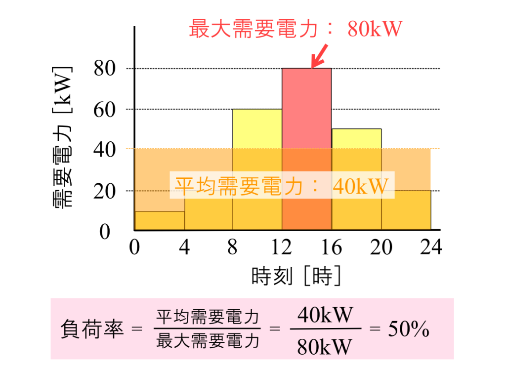 最大需要電力に対して平均需要電力がどのくらいかを表すのが、「負荷率」です。