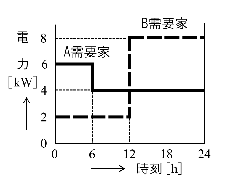 最大需要電力はA需要家が\(6\)[kW]、B需要家が\(8\)[kW]です。