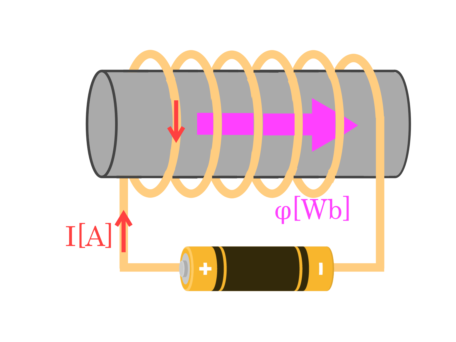 導体に電流が流れたことにより、ソレノイドコイルを貫く磁束 \(φ\) \([Wb]\) が発生します。