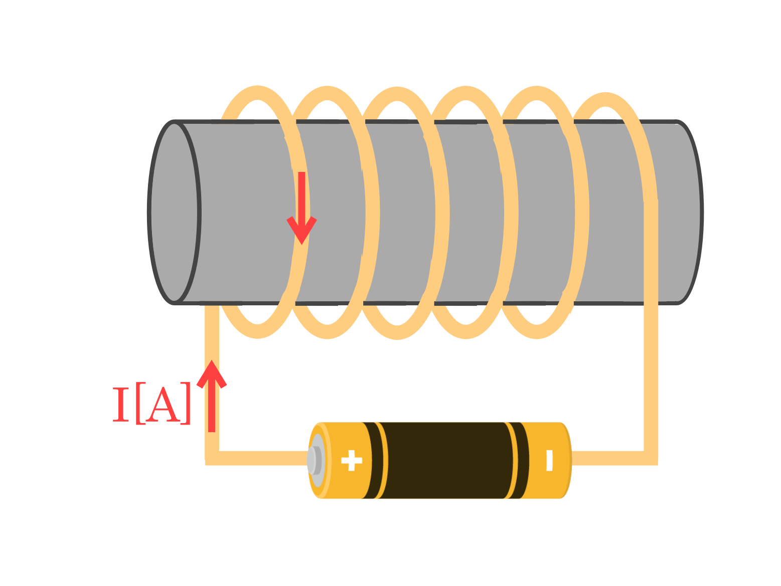 そこで、今回は図のようなソレノイドコイル(円筒型のコイル)に電池がつながっている状況を考えます。