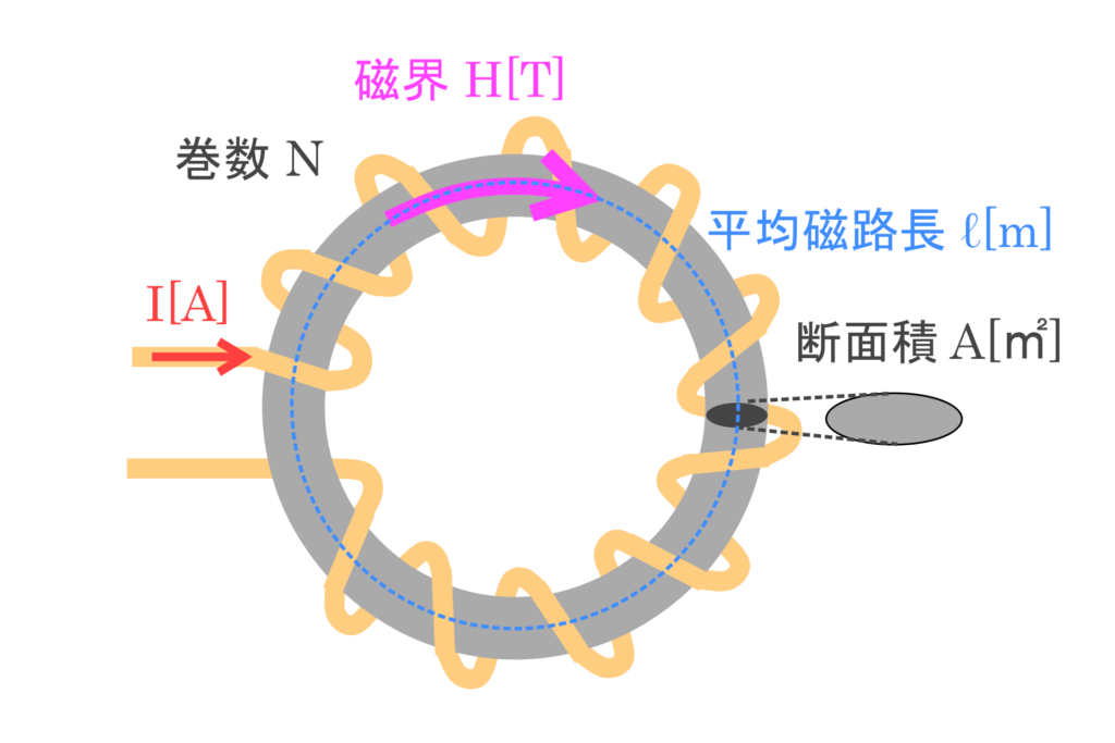 \(L:自己インダクタンス[H]\) \(N:巻き数[回]\) \(φ:磁束[Wb]\) \(I:電流[A]\) \(μ_0:真空の誘電率[F/m]\) \(μ_r:比誘電率\) \(A:鉄心の断面積[㎡]\) \(ℓ:平均磁路長[m]\)