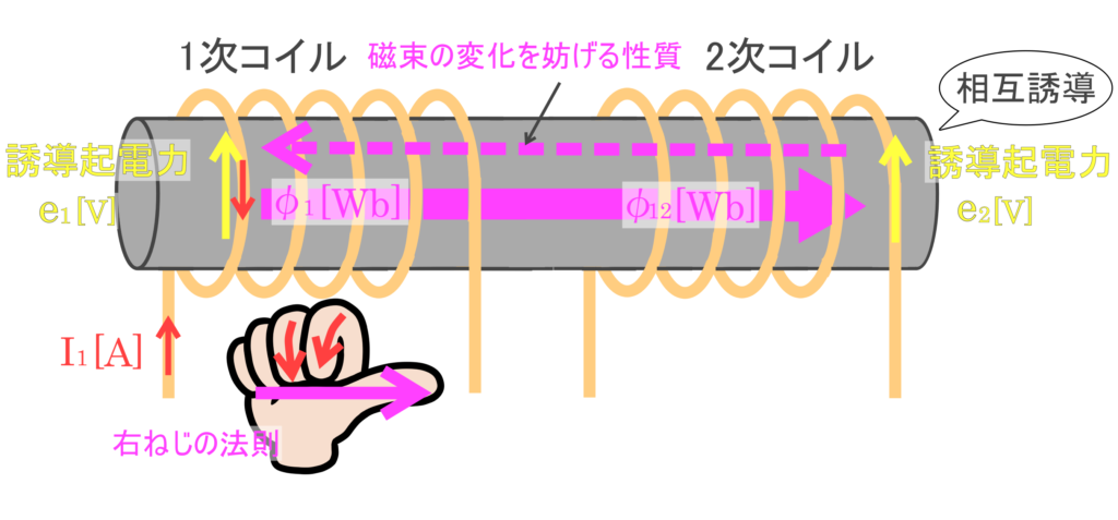 2次コイルは1次コイルの変化のせいで起電力を発生させるので、このような現象を「相互」誘導といいます。
