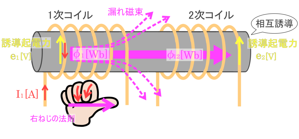 一次コイルを通る磁束は、全て2次コイルを通るわけではありません。