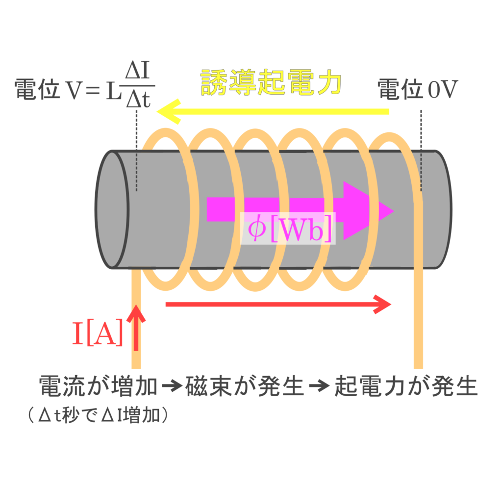 このとき、図のようなコイルの右側を\(0V\)とすると、左側は\(\displaystyle{e=L×\frac{ΔI}{Δt}\ [V]}\)となります。