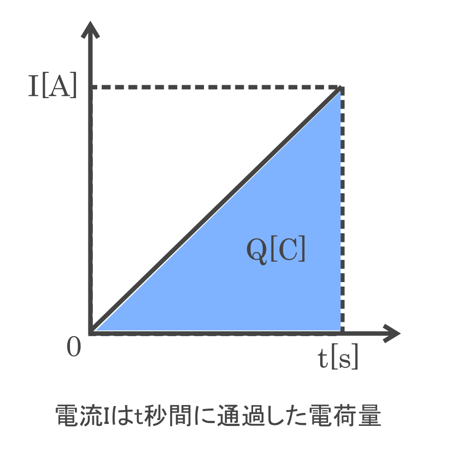 青く塗りつぶした面積が、コイルを通過した電荷量 \(Q[C]\)(時間当たりの電荷量)になります。