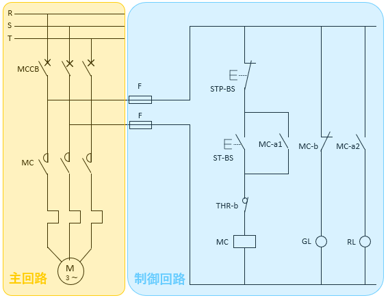 通常は一般の電気回路図とは区別して記載しています。図の右側のように制御回路は見た目も変わっています。読み方については別記事で解説しますが、原則として制御の順番、信号の流れる方向に並んでいて、機器の配置は無関係です。図で言えば、制御の順番は左から右へ、信号の流れは上から下へ向かうことを表しています。