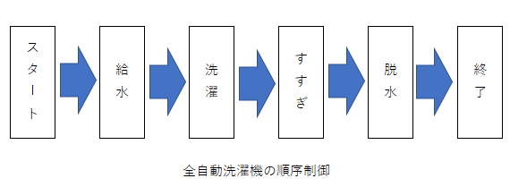 図のような給水から洗濯、脱水など決められた順序で動作するように制御することを「順序制御」といいます。